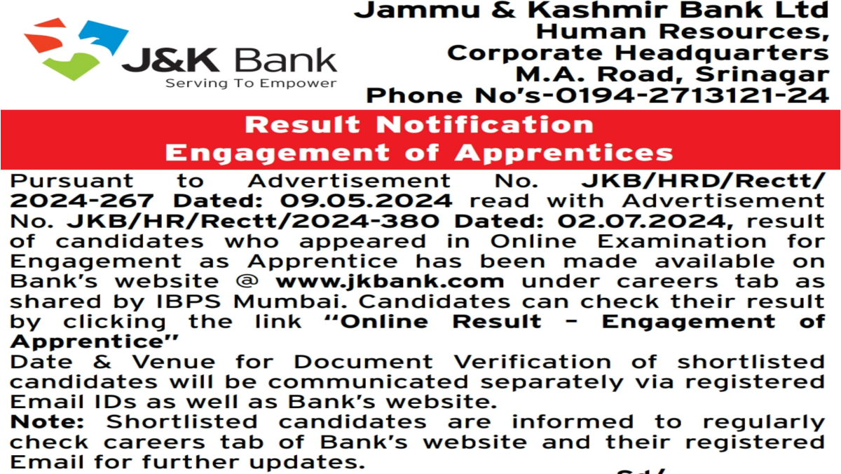 JK Bank Apprentices Result 2024: Result Out for JK Bank Apprentices Posts, Check Cut Off & Result